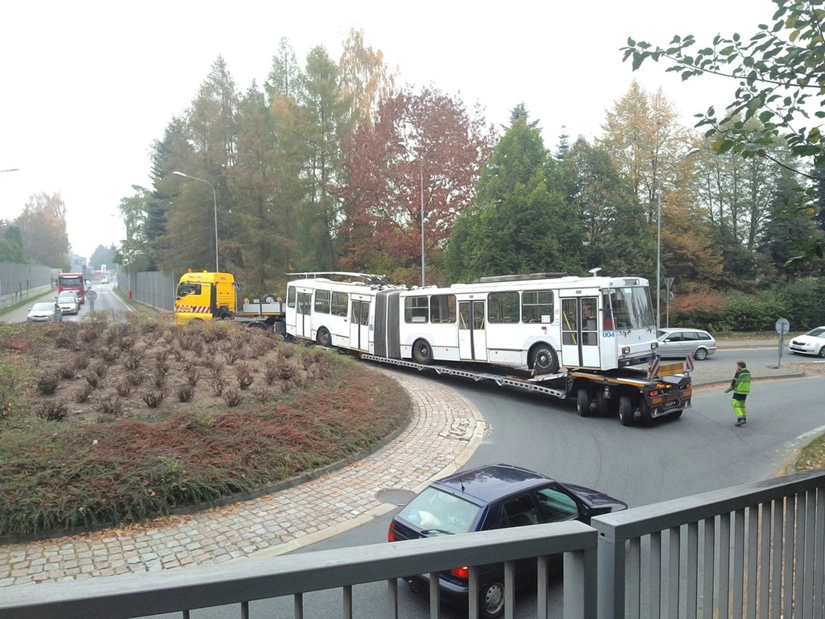 Foto 2: Der in Sonderanfertigung hergestellte Tiefbett-Auflieger transportierte im Jahre 2018 unter anderem diesen Gelenkbus.