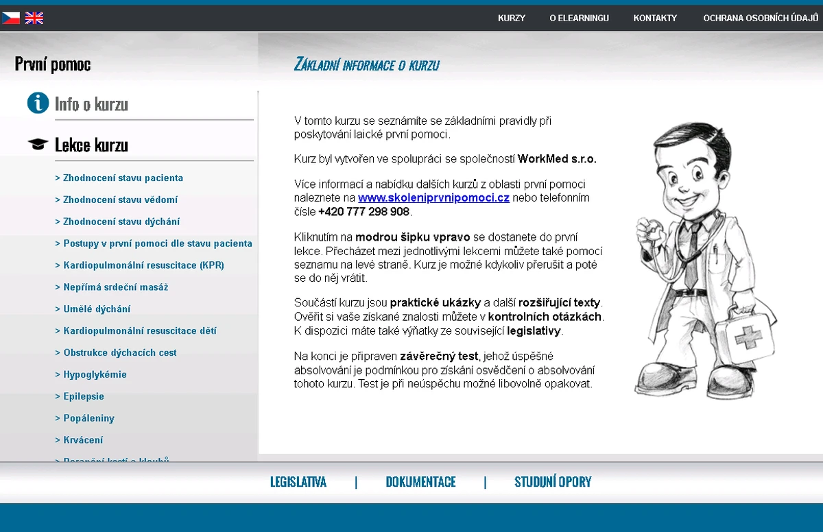Kurz Vám zabere zhruba dvě hodiny času. Můžete od něj přitom kdykoli odejít a zase se k němu vrátit a pokračovat tam, kde jste skončili. Nijak tedy nezasáhne do Vašich povinností a denního režimu. V kurzu se seznámíte se základními pravidly při poskytování laické první pomoci. Součástí kurzu jsou praktické videoukázky a další rozšiřující texty. K dispozici máte také výňatky ze související legislativy. Doplňující materiály jsou stručné a videa jsou velmi krátká, což má výhodu v tom, že Vás nezačnou nudit a budete jim věnovat plnou pozornost. Ověřit si vaše získané znalosti můžete v kontrolních otázkách. Tyto otázky se pak objevují v závěrečném testu, který obsahuje deset otázek a je možné ho libovolně opakovat. Závěrečný test není náročný, zvláště pokud si vyzkoušíte kontrolní otázky. Pro úspěšné absolvování je podmínkou správné zodpovězení alespoň osmi otázek. Poté Vám na zadaný e-mail přijde osvědčení o absolvování tohoto kurzu. Závěrečný test není v tomto kurzu nic, z čeho byste měli mít strach, a to vzhledem k jeho opakovatelnosti – je to spíše o tom, že si prověříte své znalosti získané v kurzu.
